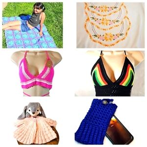 My collection includes crochet jewelry, festival crop tops, sundresses, beanie hats, scarves, gloves, cozy blankets, and artisan crochet bags—perfect as thoughtful, handmade gifts.