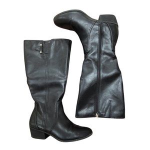 Just Fab boots have a 2 1/2 heel and circumference is 15 1/2
