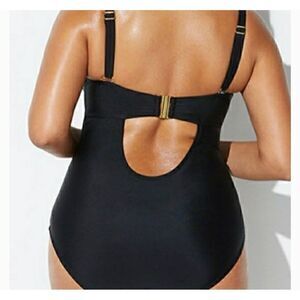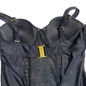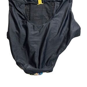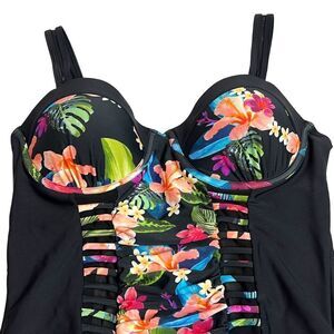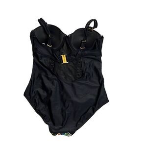 Meet.curve black and floral one piece swimsuit size L. Molded underwire cups. Gold clasp in back. Detachable straps. Runs small. Shell 82% nylon 18% spandex. Lining 88% polyester 12% spandex. EUC.