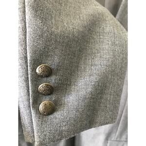 Meeting Street men's sportscoat or blazer in wool poly blend. Fully lined and has three pockets inside and two pockets on the outside. Flap on outside pocket may be worn in or out of pocket for your preference. Medium gray color with pewter color buttons with emblem as shown in pictures. 42 R. Forty Two Regular.