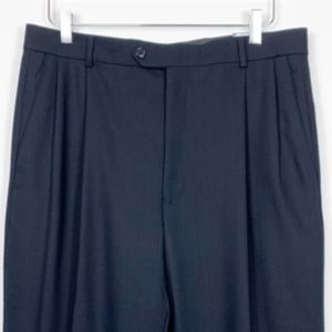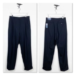 Meeting Street navy 100% worsted wool dress slacks. Pleated front. 2 front & 2 back button pockets. Comfort waistband. Cuffed. Zip, bar tab, button & inner button close. Natural stretch fabric. Year round weight. 34W x 34L. NWT.