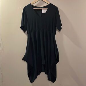 This black sundress features a chic asymmetrical high-low hemline, perfect for casual or work settings. The V-neckline and short sleeves add a touch of elegance to its relaxed silhouette, making it a versatile wardrobe staple. An expensive classy dress for a steal of a price! Size XS, meant to be worn loose, would fit larger see measurements. Content fabric tag has been cut off.