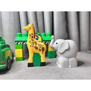 Listing is for a preowned item in good condition, includes truck, zoo lady, zoo entrance sign, elephant, giraffe and extra blocks