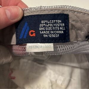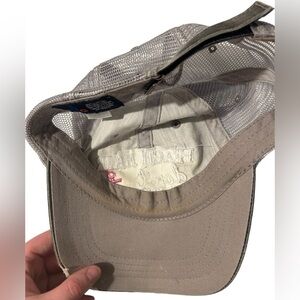 good condition, some staining on the inside, pony tail back, velcro closure, one size fits most, mesh backing