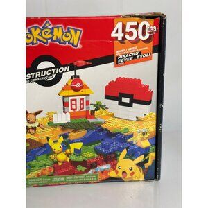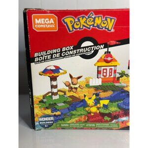 Mega Construx Pokémon Building Box with pieces, featuring Pikachu, Eevee, and Poké Ball builds. A fun and creative set for collectors, kids, and fans of Pokémon.