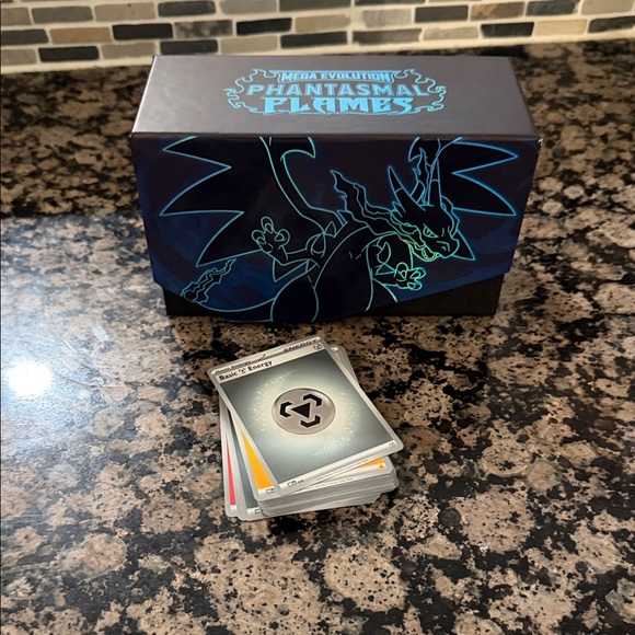 Mega Evolution Phantasmal Flames card box with a stack of trading cards. Features a striking blue dragon design. 47 basic energy cards and box!