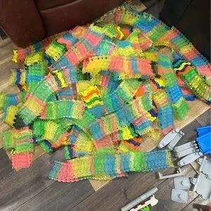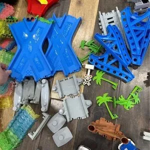 Multiple bridges, ramps, x cross pieces, lane changer, straightaway extensions, track lifters, gate, palm trees and even an elevator! Some of the track may glow in the dark but this is a combo of multiple packs. Will come in a comforter sized zipper bag.