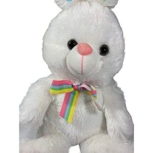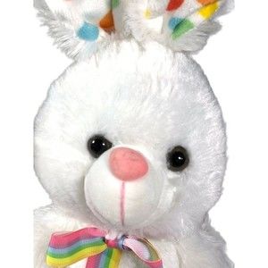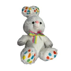 Adorable and extremely soft, white rabbit. This rabbit has stays in the ears to keep them up and polka dotted Minky fabric on the ears and paws. The eyes are acrylic and show minimal scratching. The nose is pink. There are small marks on the nose but I havent tried to clean it. Buyer responsible for cleaning. Mouth is embroidered. This bunny has a rainbow ribbon around the neck. It measures 14 inches. No stains or defects noted other than the nose.