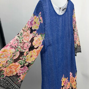 So pretty! Blue with bright florals at hem and arms. Sheer with lining. Girly and flirty! Pit to pit 19. Length 35. Teardrop opening with golden button at nape.