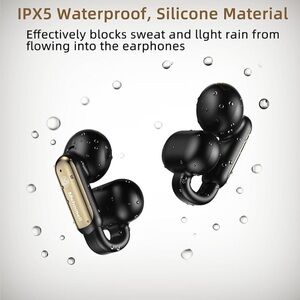 Compact black and gold wireless earbuds by Mehomei. Lightweight and comfortable for all-day wear. These are wireless open ear headphones. They are water and sweat resistant, and our ultra light and comfortable item is brand new in the box and still sealed.