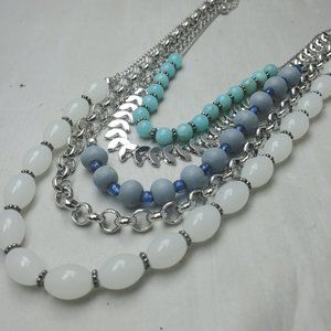 5-Strand Statement Necklace, a captivating fusion of elegance and bohemian flair. Crafted with meticulous attention to detail, this necklace features a dynamic combination of turquoise, white, and blue beads, along with silver link chains, creating a stunning visual masterpiece.