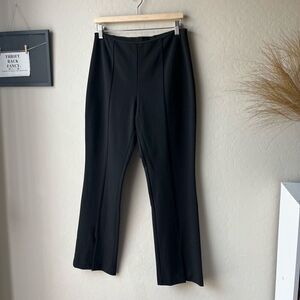 Meimeij solid black pants with a flared straight leg with split detail at the front hems. Pull-on with elastic waist. Seamed front. Viscose blend. Size 46 (L/10).