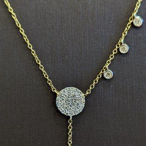 Elegant and sleek pave diamond lariat necklace by Meira T in 14 karat yellow and white gold. Diamond weight is 0.48 carats total. This necklace features a diamond pave circle, three off-center bezel set diamond charms and a gorgeous diamond pave teardrop at the end of the necklace. The diamond pave teardrop hangs approximately 4.25 inches below the diamond pave circle. Necklace is adjustable 14 to 17 inches to the diamond pave circle.