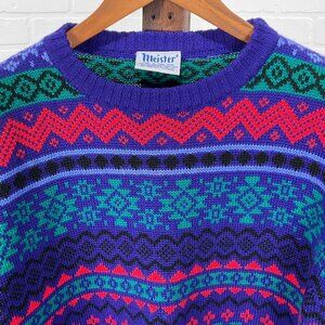 Vintage MEISTER men's large pullover sweater in a blue, red, green, and black Fair Isle pattern. Made from high-quality wool in the 80s, it hails from Hong Kong, featuring a classic ski design.