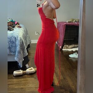 Brand new with tag never been worn. I believe this particular dress is sold out online. Chain strap for around the open back and sexy slit up the side. Love this dress I just don’t have anywhere to wear it unfortunately. The color is a bright red, stunning in person.