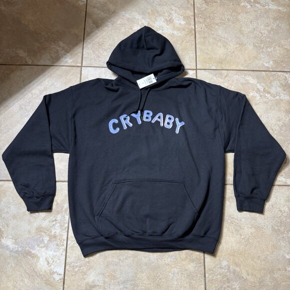 Crybabies, celebrate the 10th anniversary of Melanie Martinez's Crybaby (2015) with re-imagined merch. This black hoodie shows the album's title in balloon letters across the chest. The back shows a vintage-inspired illustration of a crying bear with bows on its ears, holding a little girl doll. Block letters spelling "CRY" surround the bear. Front kangaroo pockets and drawstring hood.