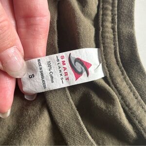 Short sleeve tee with fairy and mushroom graphic. Olive green base with pink and brown accents. Unique and artistic design.