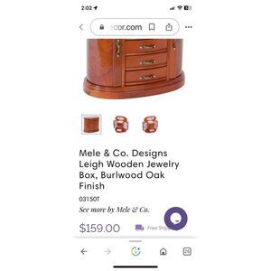 Mele & Co. Oak finish wooden jewelry box. Flattened cylindrical shape.