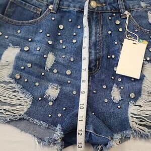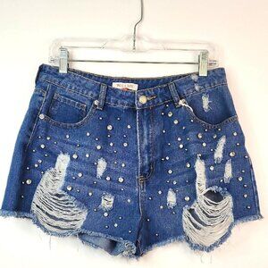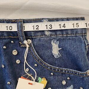 Mele E Pere Women's Distressed Jeweled Denim Blue Jeans Shorts, size Large