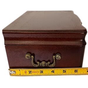 Mele Wood Jewelry Box Vintage 80s Velvet Lined Organizer Victorian Farmhouse. Condition is pre-owned and vintage 80s. VERY MINOR surface wear. The inside pouch appears a little stretched out. The tray lifts out. Sticker on the bottom. Measures about 6.5" x 9.5" x 4.75". Please see all photos for detailed condition.