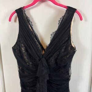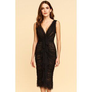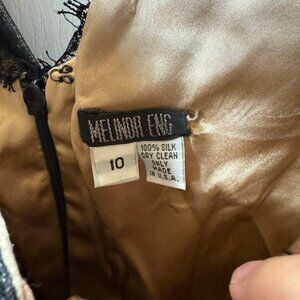 This stunning Melinda Eng designer cocktail dress exudes timeless elegance and craftsmanship. Made in the USA, it features a 100% silk champagne-toned lining beneath a delicate black lace and tulle overlay. The design showcases ruched detailing that creates a flattering hourglass silhouette and a dramatic cascading front drape. A deep V-neckline and subtle lace trim add romantic sophistication, while the back zipper ensures a smooth fit.