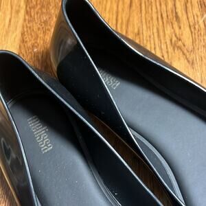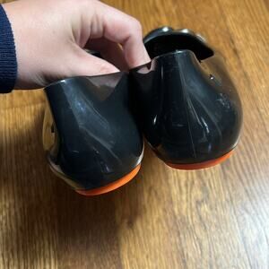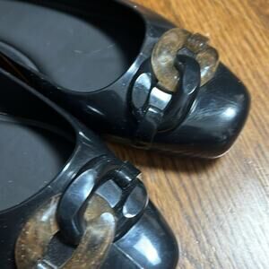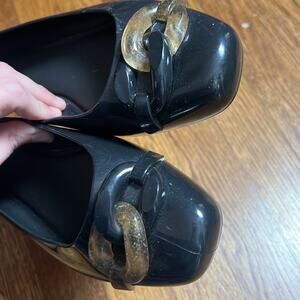 Signature fruit-scented PVC adds a playful sheen to a minimalist flat balancing a chunky chain ornament on the toe.
