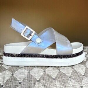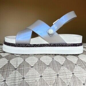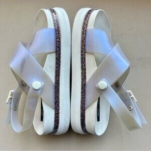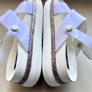 MELISSA AWAYTOMARS White Cosmic SANDALS II Glitter Platform Soles Women’s Size 6. Thick straps have an iridescent look almost. There are some scuffs on the straps, heels & soles as noted in the photos, but overall in good condition. Please consider bundling for the best deal. Thank you for shopping.