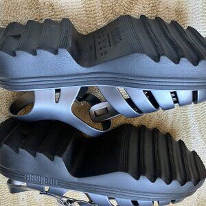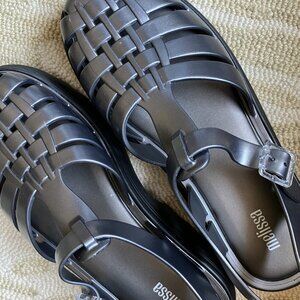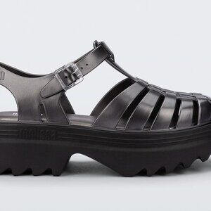 Chic charcoal jelly sandals by Melissa. Features a woven design for comfort and style.