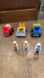 Includes a dump truck, cement mixer, front loader, 3 play figures and 2 road barriers