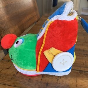 Learning Shoe is the soft, textured plush shoe that's covered with fascinating fastenings for babies and toddlers to explore. Young children can pull and press the self-stick tab, twist and pull the laces, open and close the zipper and loop the oversize button through its hole. Squeakers, jingle bells and crinkle-fill add fun to every movement! This exceptional plush baby toy is terrific for fine motor skills and hand-eye coordination.