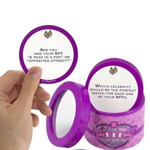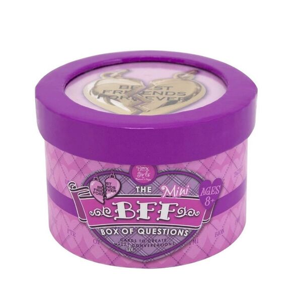 •Set - Could you know your best friends even better? Each Box Girls Mini set has a pile of 42 conversation-starters that will get the conversation rolling--and may have you rolling with laughter! The BFF set has all the funniest, sweetest, most-embarassing questions to make sure you know ALL about your bestie, and the cool mini-size set pops in a purse so you can get the scoop anywhere!