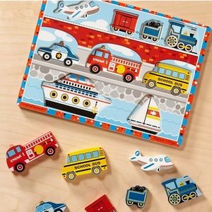 9-piece wooden puzzle with "things that go" theme
