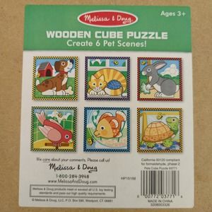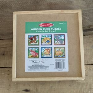 Melissa & Doug - Wooden Cube Puzzle - Create 6 Pet Scenes - 16 Pieces - Preowned. This puzzle is in great preowned condition. Puzzle measures 7.95" x 7.95" x 2.15".