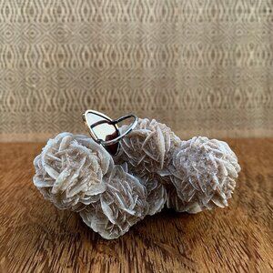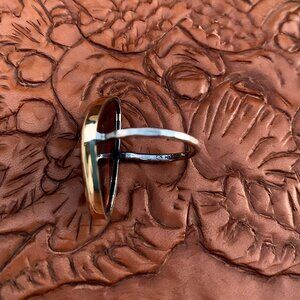 Tiger's eye-- a semi precious stone of strength and courage, bringing confidence and equilibrium, both in times of trouble and peace. The silversmith at Melissa Joy Manning skillfully transformed this beautiful reflective specimen into a perfectly scaled, charismatic ring, with a modern yet nostalgic feel. The Mother Earth free spirit aura is well represented, in the organic, reflective hue of the stone. Yet an atomic, modernist feel is present as well, through the sleek, sculptural, scalene triangular form. The stone surround is made of 14k recycled gold, the band is signed and made of hammered silver. Condition is excellent, comes with MJM jewelry pouch and card. I wear 6.25 to 6.5. Price firm.