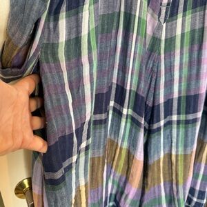 Melissa McCarthy and Seven collaboration. Super soft plaid. Fabric does pull easily. There are some existing pulls, see picture nine for an example. Button down part way. Collar. High low. Different pattern on the inside that you can see when you walk. I’ve worn this as is and over jeans. Looks great both ways.