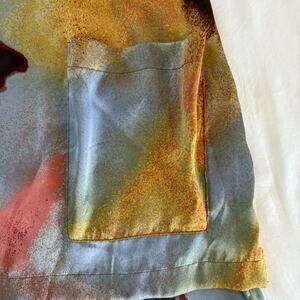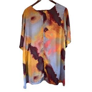 This Melissa McCarthy Seven7 blouse in size 1X is a colorful and bohemian-themed tunic perfect for various occasions such as parties, casual outings, or meetings. Featuring a relaxed fit, short sleeves and a pocket, this abstract patterned top is made of lightweight polyester material, making it ideal for warmer weather. The pullover closure and round neckline add to the comfortable and stylish design of this oversized blouse, which is sure to make a statement with its unique and eye-catching multicolor palette. The chest measures 49 inches, the front length is 26.5 inches, and the back length is 31 inches.