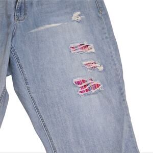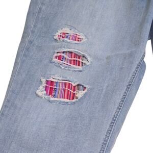 Unleash your free spirit in these uniquely stylish jeans. A light wash provides a versatile foundation, while the distressed detailing introduces an edgy, contemporary vibe. Colorful patterned patches peek through the intentional rips, offering a playful contrast and individual flair. The relaxed fit ensures comfort without sacrificing style, perfect for a laid-back yet fashionable look. Rock these jeans at a casual weekend brunch, a music festival, or while exploring your city's hidden gems.