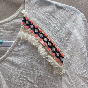 Cream color slub fabric with shoulder embroidery and short fringe detail