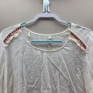 Gently used Melissa McCarthy Seven7 boho top, loose fit with colorful shoulder embellishments in size 1x. Cotton/rayon blend
