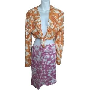 Vibrant asymmetrical skirt by Eloquii. Features bold pink and orange patterns. Perfect for a standout look. Usually ships same or next day
