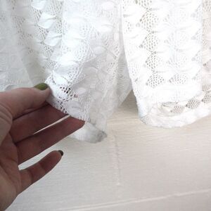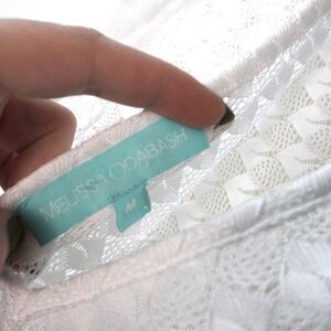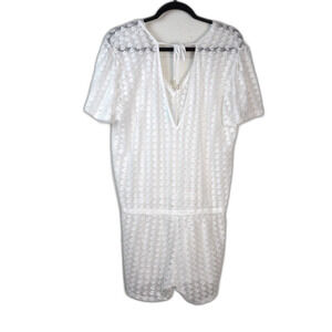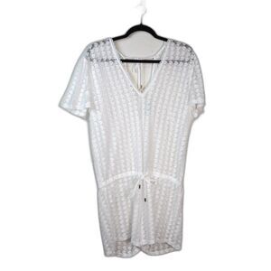 EUC Melissa Odabash white lace-like swim coverup in size medium. Still sold on website! Per Melissa Odabash website - Capture the spirit of island living in the Lola Romper. In classic White, this light-weight design is an elevated take on the summer romper, crafted from a luxe, fine knit. Featuring a v-neck and back, it ties at the nape of the neck, with pretty frilled sleeves adding to its charm. A drawstring waist defines your silhouette and is finished with Odabash golden cordends.