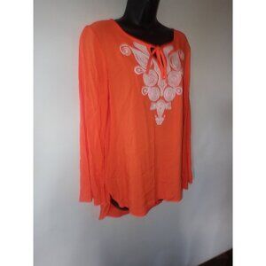 Melissa Page Womens M Embroidered Orange Boho Blouse Tie Neck & Long Sleeves New