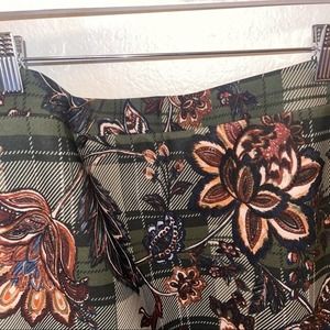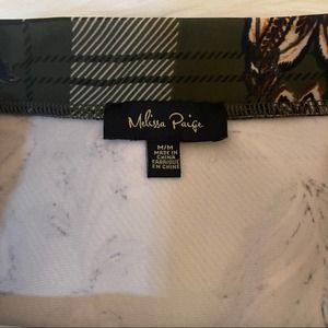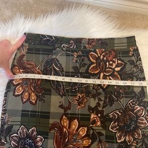 Melissa Paige Green Orange Floral Plaid Pattern Pencil Skirt. Green & orange/mustard floral & plaid print all over. Classic plaid skirt with a fun floral twist. Green and brown plaid with orange flower print all over. Thin waistband and no slit. Pull on style.
