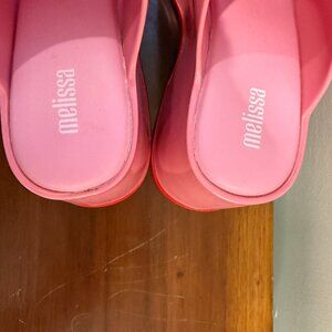 The Melissa Patty Pink Platform Wedges purchased from Free People are stylish and comfortable heels for women in a size 8. These slip-on wedge heels are pink with orange soles with a platform style and high heel height. The upper material is made of rubber, making them durable and easy to maintain. Perfect for adding a touch of height and fashion to any outfit, these Melissa wedges are a trendy choice for women looking for a chic and versatile footwear option. Excellent condition.