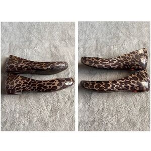 Great used condition. Leopard Peep Toe Ballerina Jelly Flats by Melissa in tan with brown and black detailing. Quirky whimsical aesthetic, a versatile style that can be dressed up or worn casually. Classic jelly slip-on ballet flats with unique oval opening in toebed and round closed toe. Made of durable PVC. Allover leopard spot animal print, see video. Note: light streetwear to bottom sole and insole, see photos. Size 5, see photos for measurements.