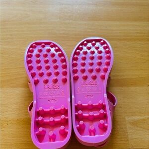 Step into summer with Melissa's pink jelly sandals, featuring a shiny, translucent design and a woven pattern on the upper. These flat sandals are crafted from smooth, glossy PVC material, making them perfect for beach activities and water-friendly adventures. Enjoy the comfort of a molded footbed that seamlessly integrates with the sandal's upper, ensuring a stylish and practical choice for warm-weather outings.