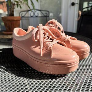 Cute light pink platform jelly sneakers by Brazilian shoe brand Melissa. Gently worn, very good condition. Selling because I revamped my wardrobe and these don't really match with anything I wear now. Comfortable and cute.