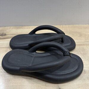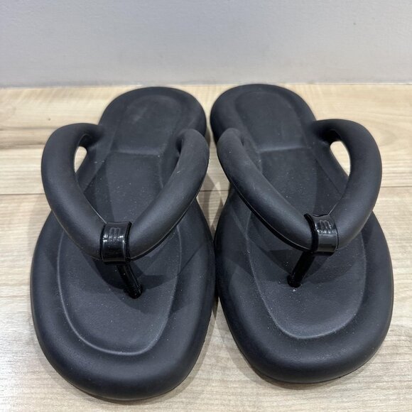 Features: Sculpted footbed for comfort, thick puffy thong strap, cushioned sole, slip-on style