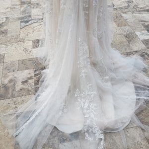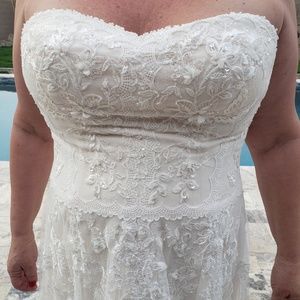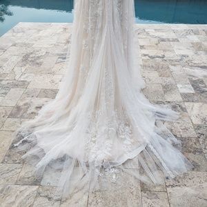 NWT. Not altered. Only worn for photos for this post. Drop waist Aline shape. Ivory/Blush. Vintage and Romantic. Style from David's Bridal. 3D Flowers. 2 layers of lace. One chantilly lace layer topped by one lace applique layer. Internal belt to hold dress up on waist.