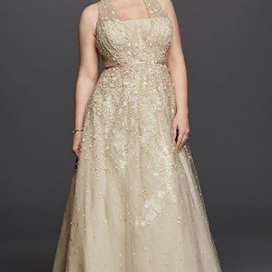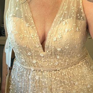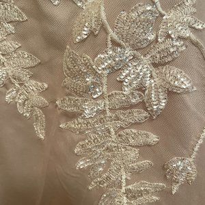 Super pretty unaltered, unworn wedding gown. Decided to go in a different direction. Size 14. New with tags, always kept in garment bag, no flaws. has plunging front and plunging back, but includes "modesty triangles" one for front and one for back if you prefer. See the stock photos for the front modesty panel in use. Under the tulle layer with the pretty 3-d flowers and jewels, there is a layer of sequined fern/leaf pattern, which just subtlly shows through underneath.